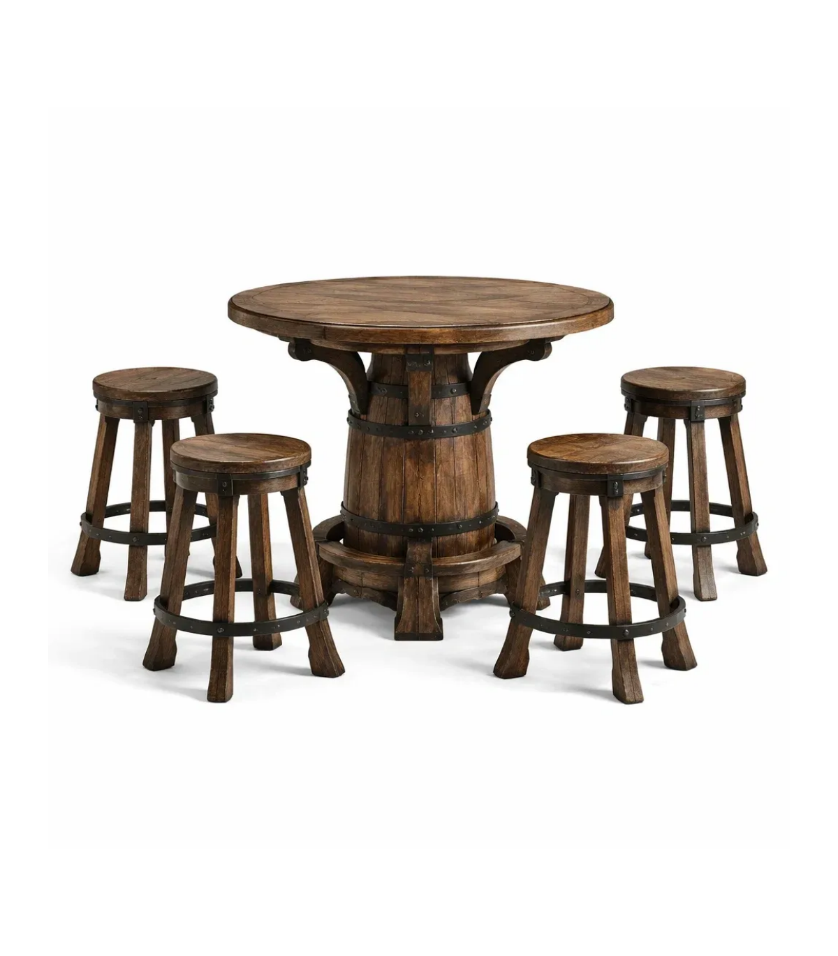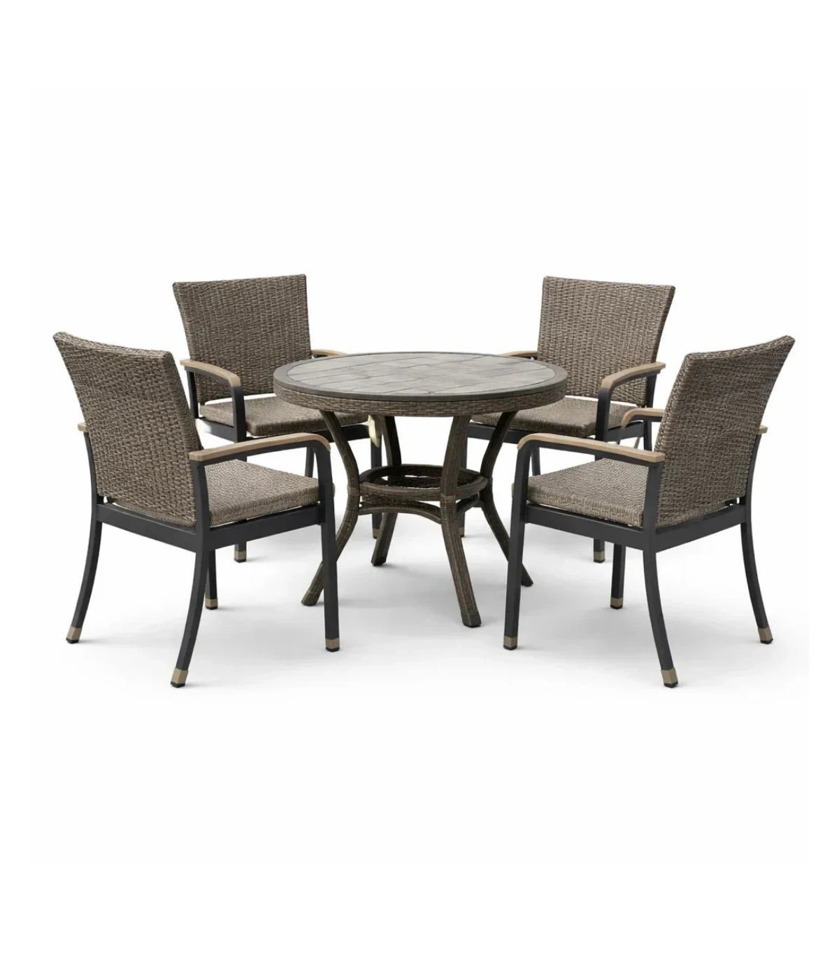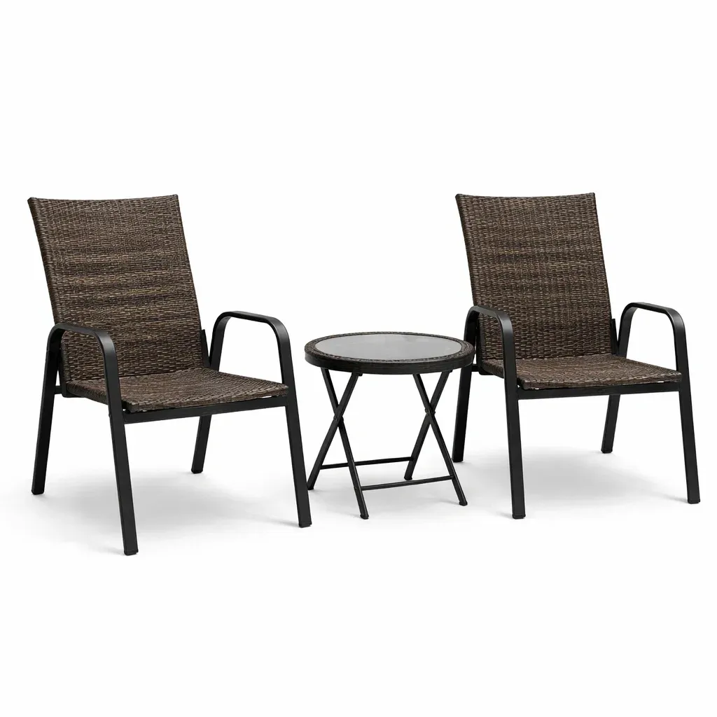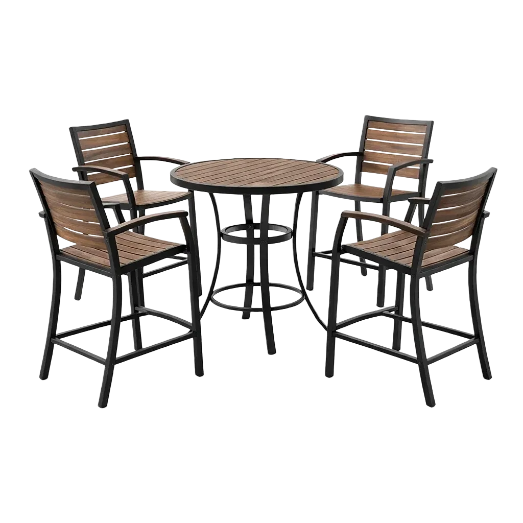 Cet ensemble de table et chaises de bar est conçu avec des matériaux tissés et un cadre en métal, adapté à une utilisation en extérieur.